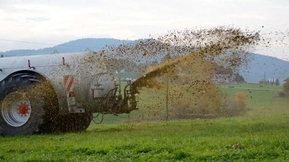 Bilder: 1. Ausbringung von Gülle auf einer Intensivfettwiese. 2. Links artenarmes Intensivgrünland, rechts artenreiche Magerwiese. 3. Intensivgrünland (Quellen: https://klimareporter.de/landwirtschaft/das-duenger-maerchen, https://de.future3.ch/news/verhungern-durch-ueberduengung, https://www.natur-lg.de/karte/vierhoefener-heide)