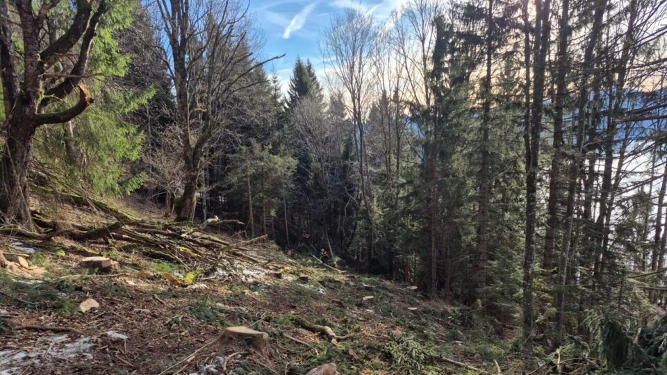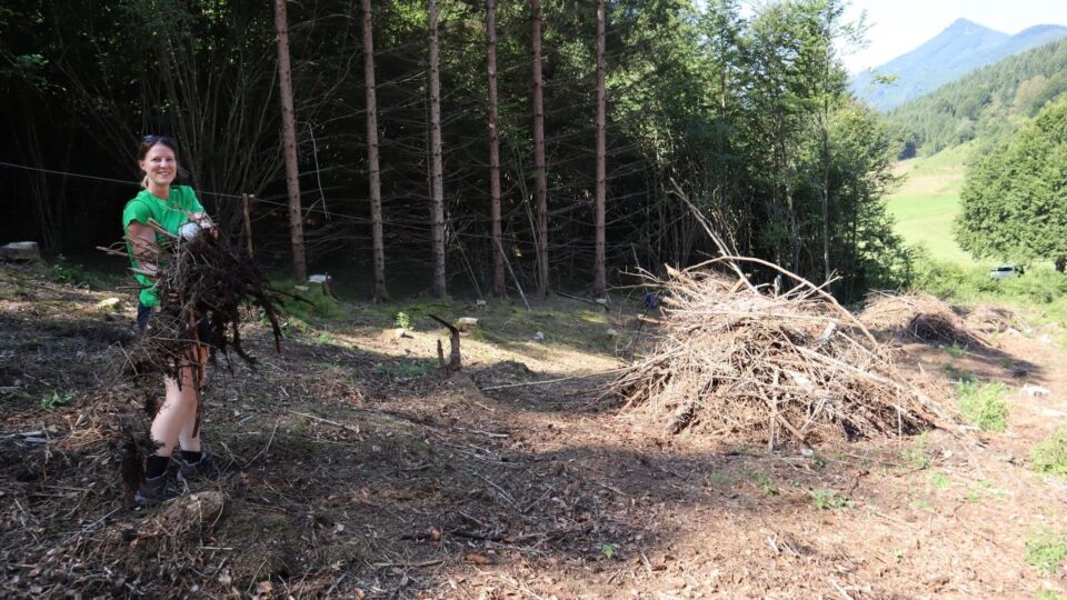 Bilder: 1. Rodung von Fichtenforst auf ehemaligen Magerwiesenflächen am Schoberstein, alte Bäume bleiben stehen. 2. Blick vom Häuslkogel aufs Kaltwasser mit schönen Solitärbäumen. 3. Schwendarbeiten mit der Motorsense. 4. & 5. Äste werden auf Haufen geschlichtet.