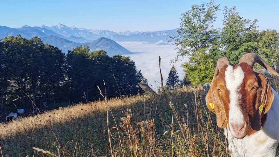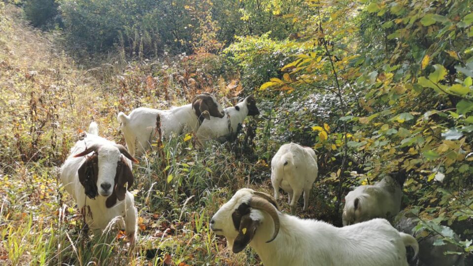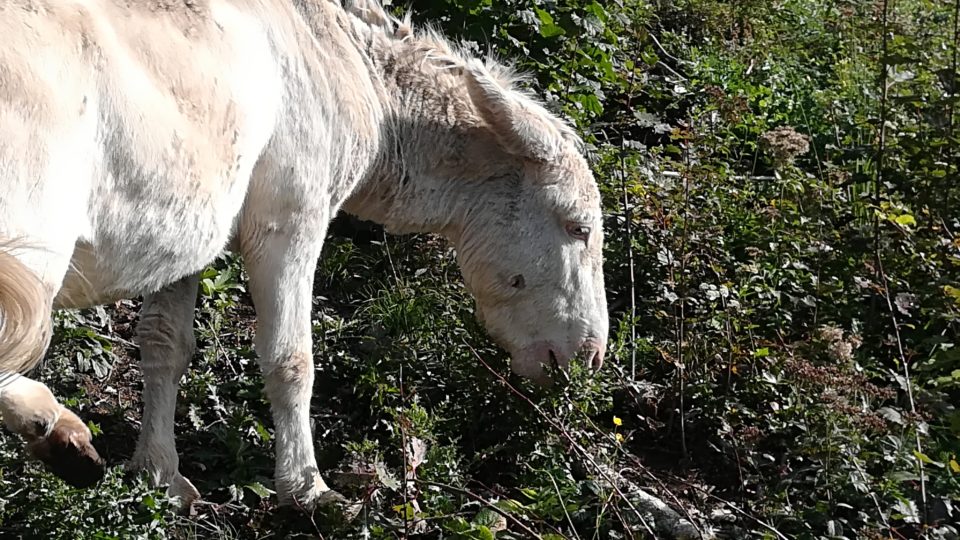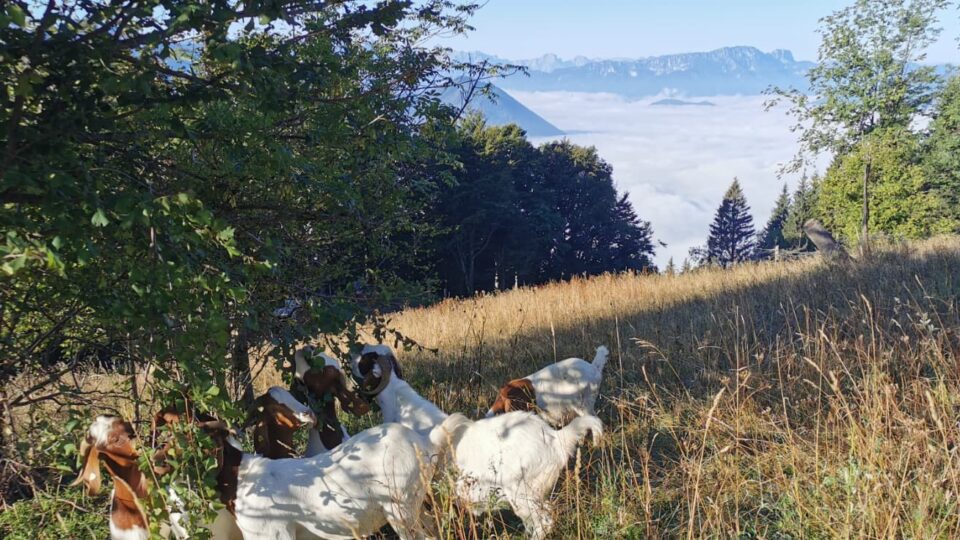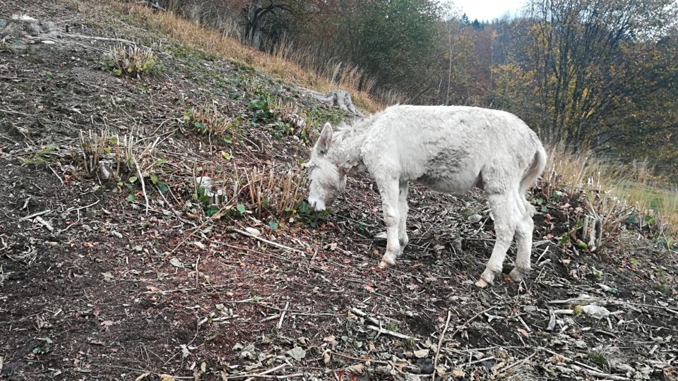 Nun kommen unsere Weidetiere zum Zug: Diese werden für wenige Wochen im Jahr auf die Fläche gelassen, wobei ihnen stets nur kleine Teilflächen zur Verfügung stehen – dies nennt sich Druckbeweidung. Sobald kein Futter mehr vorhanden ist, werden sie auf einen anderen Teil gelassen. So fressen die Tiere gründlich alle aufkommenden Schösslinge von Sträuchern und Bäumen sowie alle keimenden Unkräuter und Schlagpflanzen ab, wodurch die im Boden verbliebenen und angewehten Samen der Magerwiesenpflanzen genug Licht zum Keimen haben. Die in dieser Zeit eingesetzten Tiere sind Weiße Barockesel und Burenziegen, die unterschiedliche Nahrungsvorlieben haben. Weiße Barockesel fressen gerne Gräser und Kräuter und vertilgen sogar dichte Filzschichten am Boden, sodass wieder Licht auf die Erde fällt. Die Burenziegen dagegen stürzen sich zuerst auf die Blätter von Sträuchern, Schösslingen und Brombeeren, sodass diese stark in ihrem Wachstum gehemmt werden. Dazu kommt, dass Burenziegen ab etwa sechs Tieren ausgeprägten Futterneid entwickeln und umso gieriger fressen. Die Hufen der Weidetiere schaffen offene Bodenstellen, wo wiederum Pflanzensamen keimen können. Weitere Informationen zu den Vorteilen von Weidetieren findest du hier. Da Esel und Ziegen unterschiedliche Nahrungsvorlieben haben, eignen sie sich ideal zur Kombination. So werden die Flächen zuerst mit der einen, dann mit der anderen Art bestoßen und von unerwünschten Pflanzen bleibt wenig übrig. Später, wenn sich bereits eine geschlossene Pflanzendecke entwickelt hat, werden die Flächen mit Schafen beweidet. Die Zäune werden dabei nur bei Bedarf aufgebaut und nach erfolgreichem Einsatz der Weidetiere wieder abgebaut, um Wildtiere nicht zu behindern.