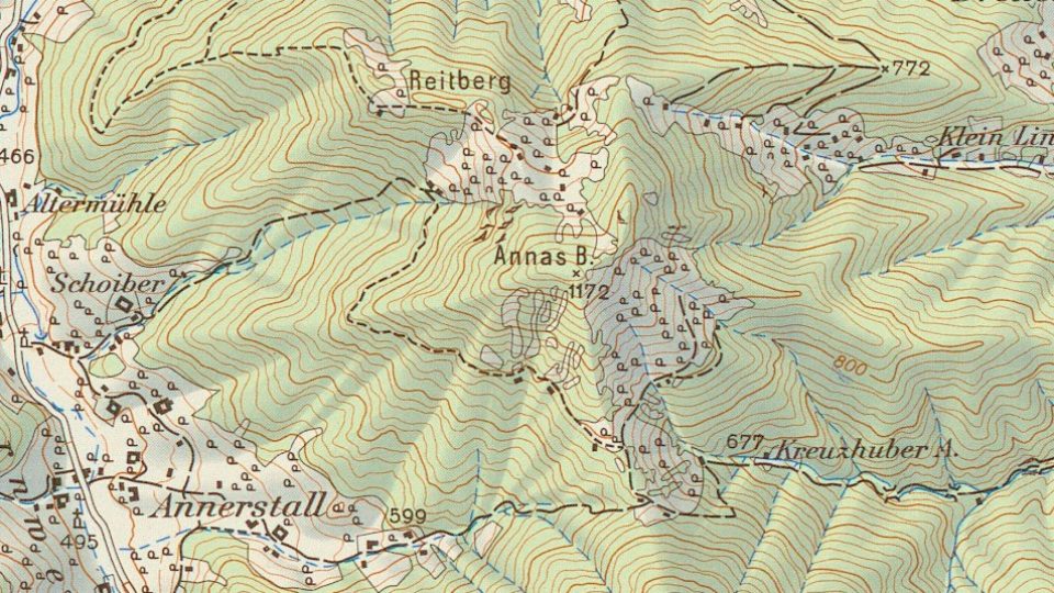 Der Annasberg war aufgrund seiner abgerundeten Form und der nicht ganz so steil abfallenden Hänge einer der wichtigsten „Wiesenberge“ Mollns. Dies ist auf dem Luftbild des Jahres 1953 sehr gut zu erkennen. Die „Toif“ ist vielen ein Begriff, doch wissen viele junge Leute nicht, dass hier auf der Nordseite des Berges einstmals ca. 20ha Bergwiesen vorhanden waren. Insgesamt mit den Osthängen und den Südhängen waren einsmals ca. 60ha Bergwiesen auf dem Annasberg verteilt. Davon sind lediglich ein ca. 10ha großer Teil auf der Ostseite und ein ca. 4ha großer Teil auf der Südseite offen geblieben.