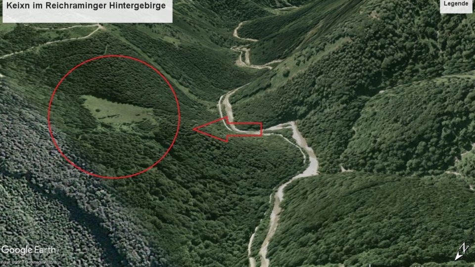 Tief im Hintergebirge nach der großen Klause, gegenüber des Föhrenbachtales liegt das Keixn. Ehemals ein Forsthaus mit kleiner Landwirtschaft dabei. Das Haus ist mittlerweile verfallen. Die Wiese gehört zum Gebiet des Nationalpark Kalkalpen und liegt auf einem Höhenplateau, malerisch von alten Fichten umgeben. Wurde bis in die Mitte der Neunziger als Weider bestoßen. 2006 übernahm Christian Hatzenbichler die Bewirtschaftung seit 2016 hat sie der Verein über. Seither wird die Wiese einmal pro Jahr gemäht und abgeheut. Die Anfahrt dauert 2,5h von Molln-Hausbach-Gaishanslniedern-Weißenbach-Großer Bach. Danach noch über einen alten schmalen Karrenweg hinauf auf das Hochplateau.