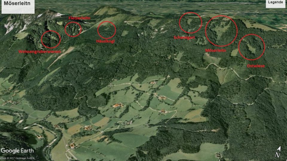 Die „Möserleitn“ ist die größte heute noch offene Mähfläche an der Südseite. Sie ist gleichzeitig auch die „steilste“ Fläche die wir bewirtschaften. Der gesamte obere Bereich hat zwischen 110% und 135% Hangneigung. Die steilsten Bereiche können nur mehr mit Sensen gemäht werden.