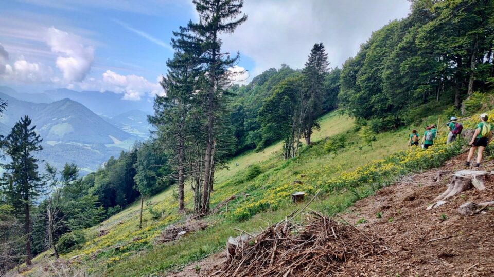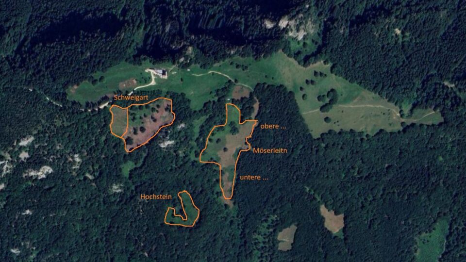 Die „Möserleitn“ ist die größte heute noch offene Mähfläche an der Südseite. Sie ist gleichzeitig auch die steilste Fläche die wir bewirtschaften. Der gesamte obere Bereich hat zwischen 110% und 135% Hangneigung. Die steilsten Bereiche können nur mehr mit Sensen gemäht werden.